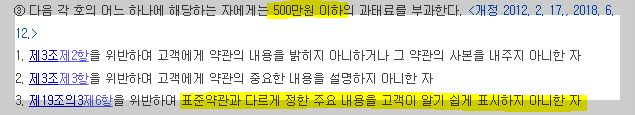 - 그러나 공정위가 콕 찝어 표준약관 사용을 권장한 사업자의 경우, 표준약관과 다른 내용을 보기 쉽게 표시하여야 하고, 그렇지 않은 경우 500만원 이하의 과태료가 부과된다.